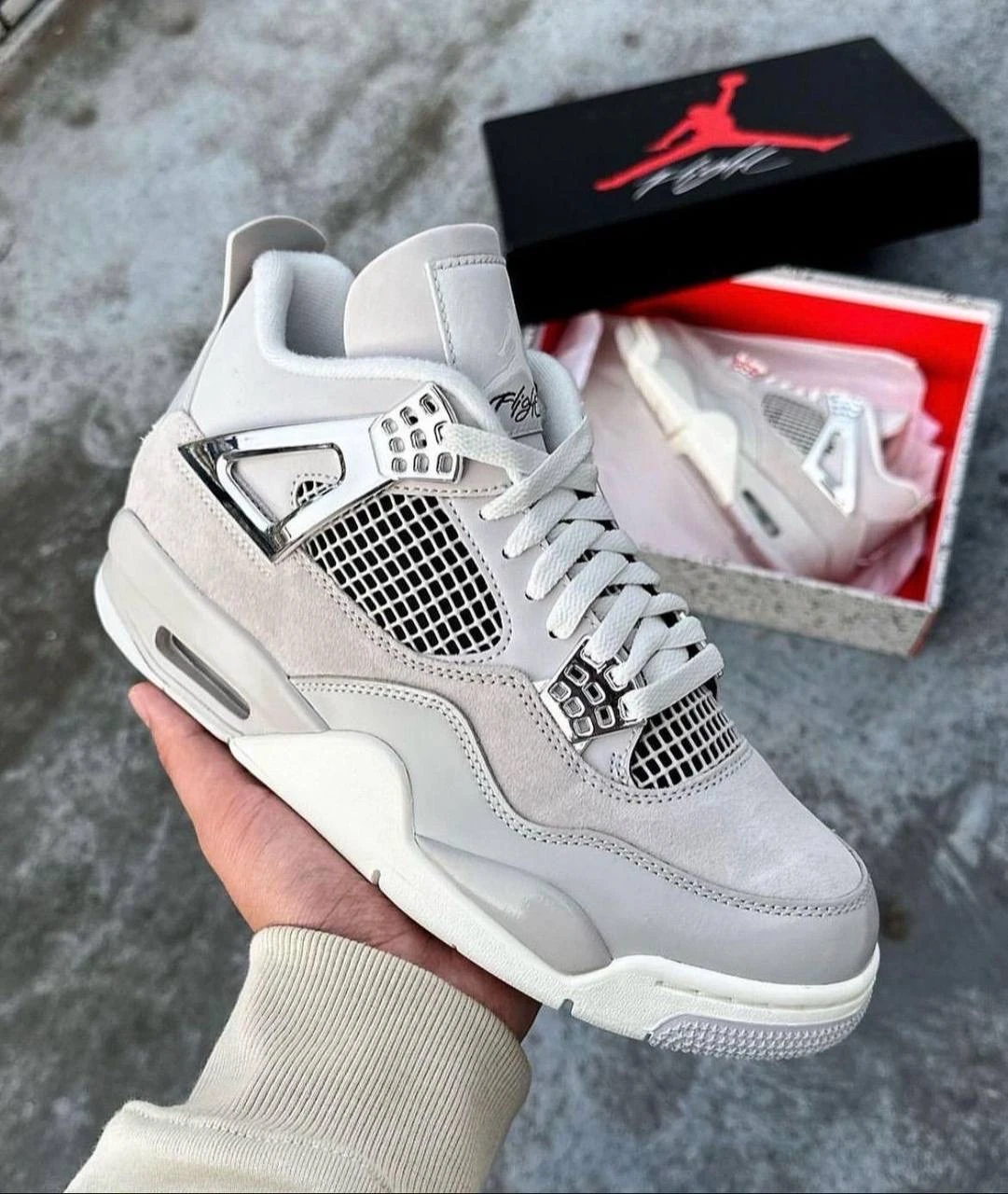 The Air Jordan 4 Retro “Frozen Moments” shines with a refined mix of tones and textures. Featuring a Light Iron Ore suede upper with neutral grey overlays and metallic silver accents, this pair balances understated elegance with bold details. Built with mesh paneling, classic lace wings, and visible Air cushioning, the design nods to Jordan Brand heritage while delivering all-day comfort and support. A durable rubber outsole completes the look, making it both versatile and collectible. Product Details: