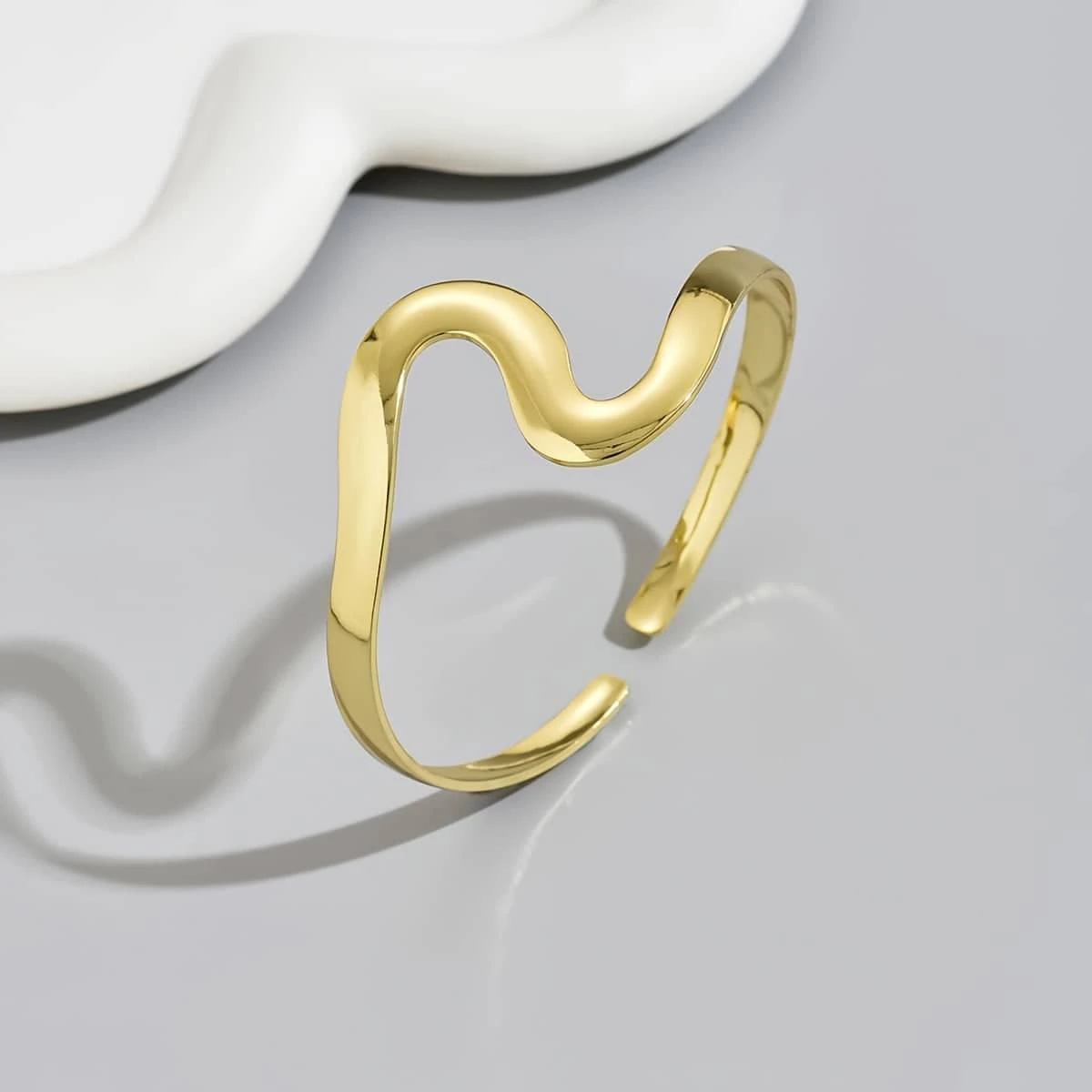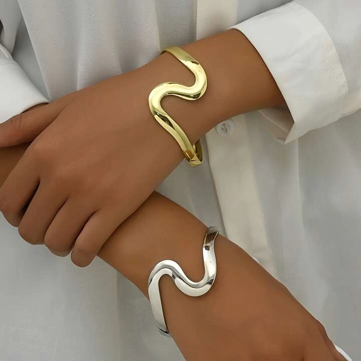 Elevate your style with this snake-inspired S-shaped open cuff bracelet. Designed with an elegant asymmetrical twist, it blends gold and silver tones for a versatile, modern look. Lightweight yet durable, this adjustable bracelet ensures a comfortable fit for any wrist. A bold statement piece, perfect for both everyday wear and special occasions. |