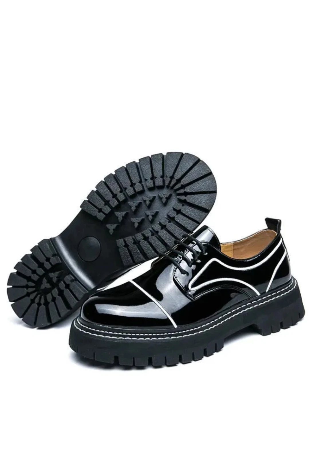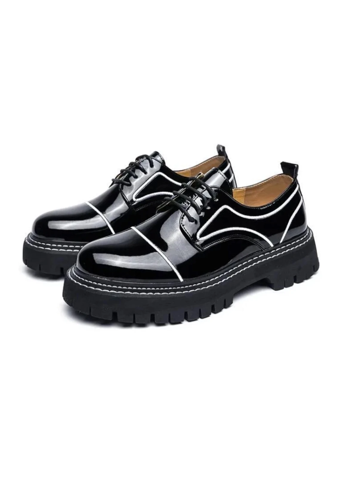 Elevate your footwear lineup with these glossy black patent leather derby shoes, designed for those who appreciate a bold yet refined statement. The high-shine patent finish delivers a sleek, modern edge, while crisp white piping adds contrast and sophistication. A chunky, sculpted sole brings contemporary attitude and all-day comfort, making this pair perfect for dressed-up streetwear, fashion-forward office looks, or evening style. Striking, polished, and confidently modern—these derbies redefine classic craftsmanship with a fresh twist |