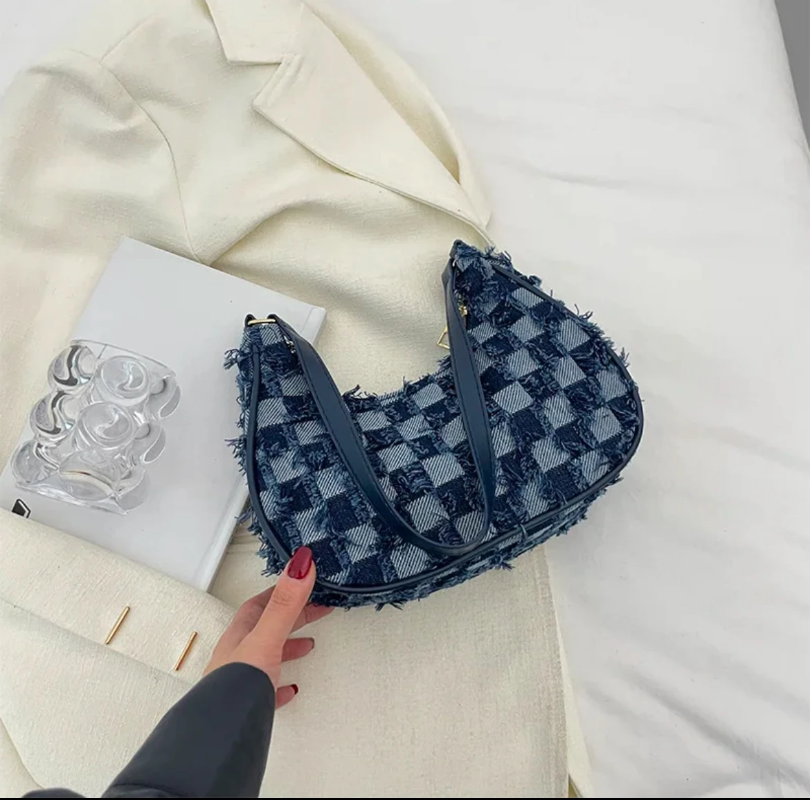 Elevate your casual look with this Stylish Denim Hobo Bag, designed with a unique checkered pattern and raw edge trim. The soft, slouchy silhouette offers relaxed charm, while the spacious interior makes it perfect for everyday essentials. Whether you're running errands or styling a streetwear outfit, this hobo bag delivers fashion-forward utility with a laid-back denim vibe. |