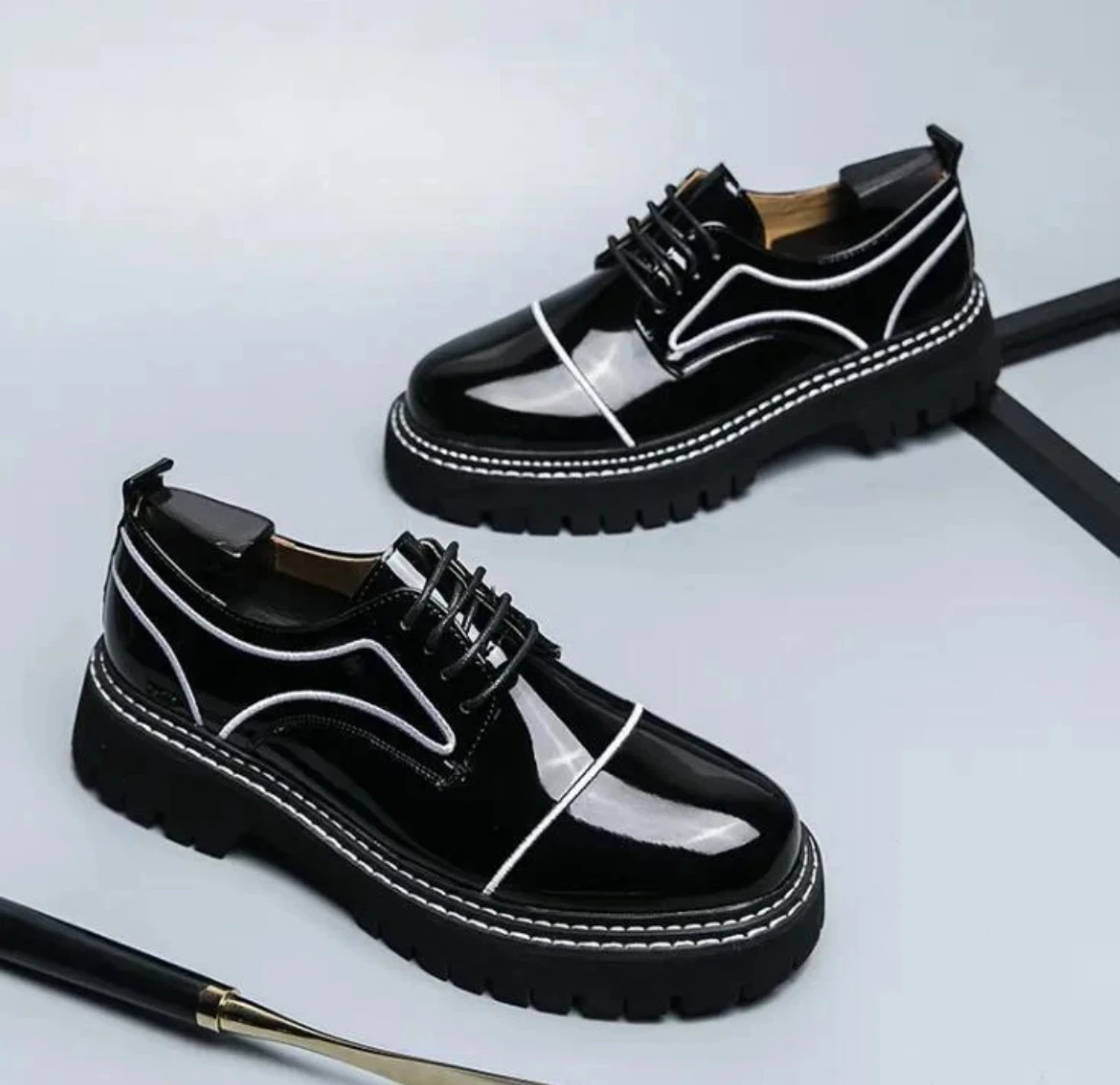 Elevate your footwear lineup with these glossy black patent leather derby shoes, designed for those who appreciate a bold yet refined statement. The high-shine patent finish delivers a sleek, modern edge, while crisp white piping adds contrast and sophistication. A chunky, sculpted sole brings contemporary attitude and all-day comfort, making this pair perfect for dressed-up streetwear, fashion-forward office looks, or evening style. Striking, polished, and confidently modern—these derbies redefine classic craftsmanship with a fresh twist |
