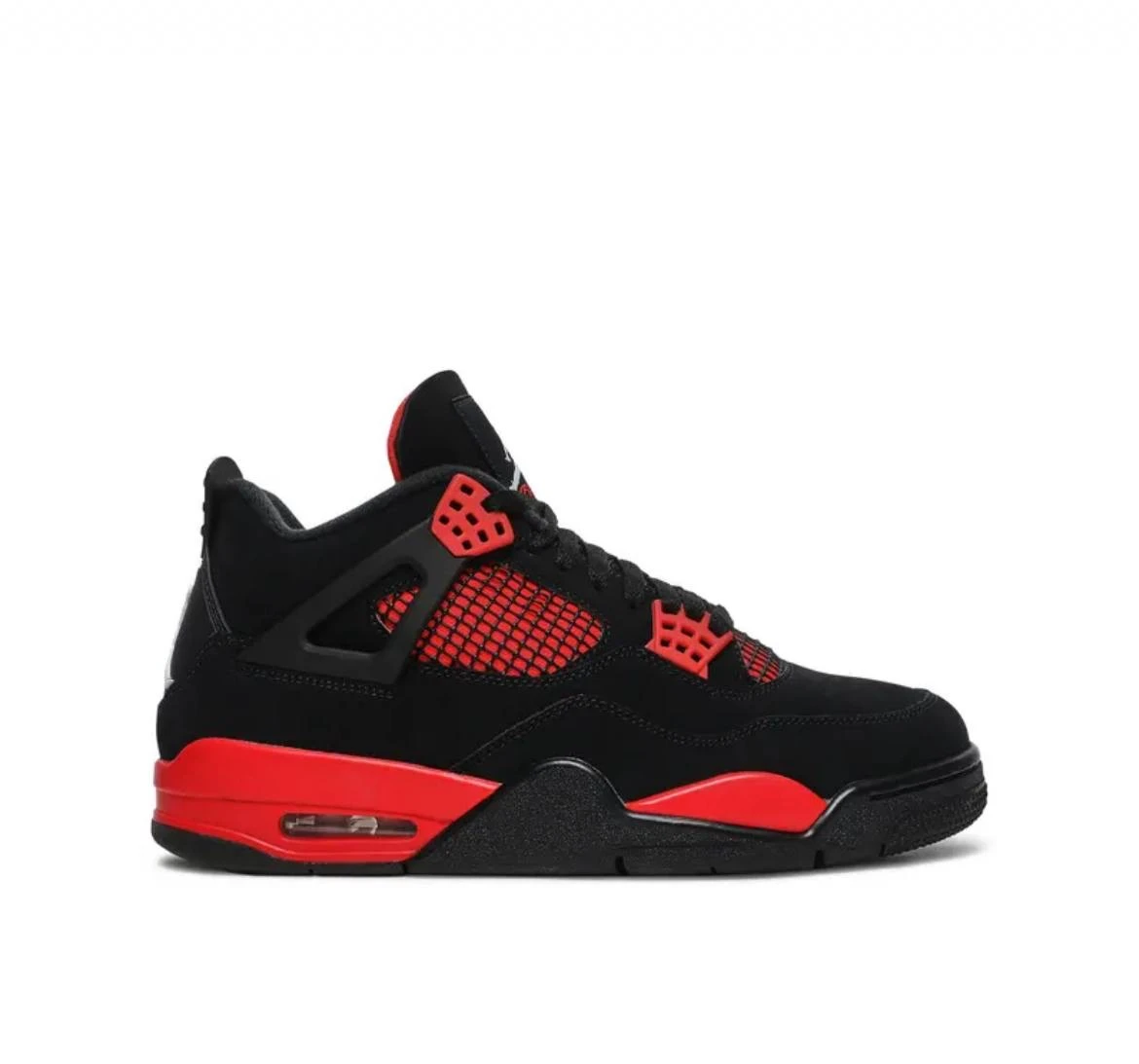 The Air Jordan 4 Retro “Red Thunder” brings bold contrast to the classic 1989 silhouette. Featuring a black nubuck upper with vibrant red accents on the midsole, lace wings, and inner mesh panels, this sneaker delivers a striking, high-energy look. Equipped with visible Air-Sole cushioning, supportive lace wings, and a durable rubber outsole, it combines comfort, performance, and timeless Jordan heritage. Product Details: