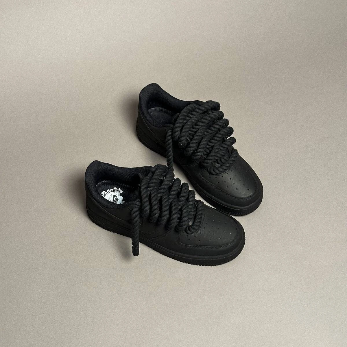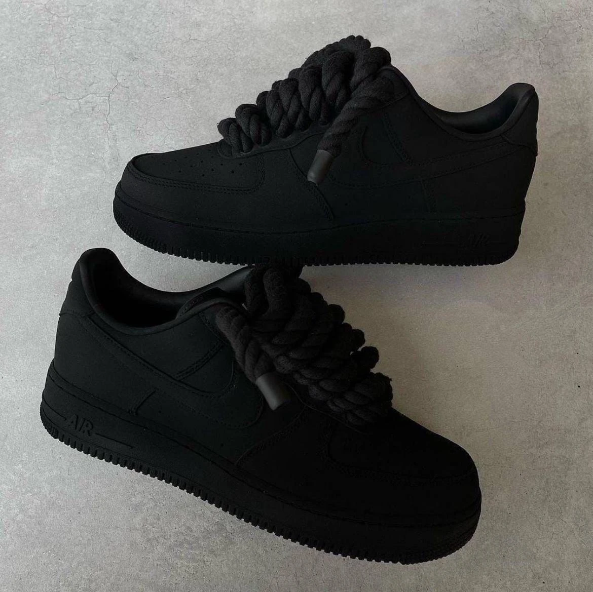 The Nike Air Force 1 Matte Black “Rope Laces Black” V1 is a sleek and versatile essential, perfect for both casual wear and bold street fits. |